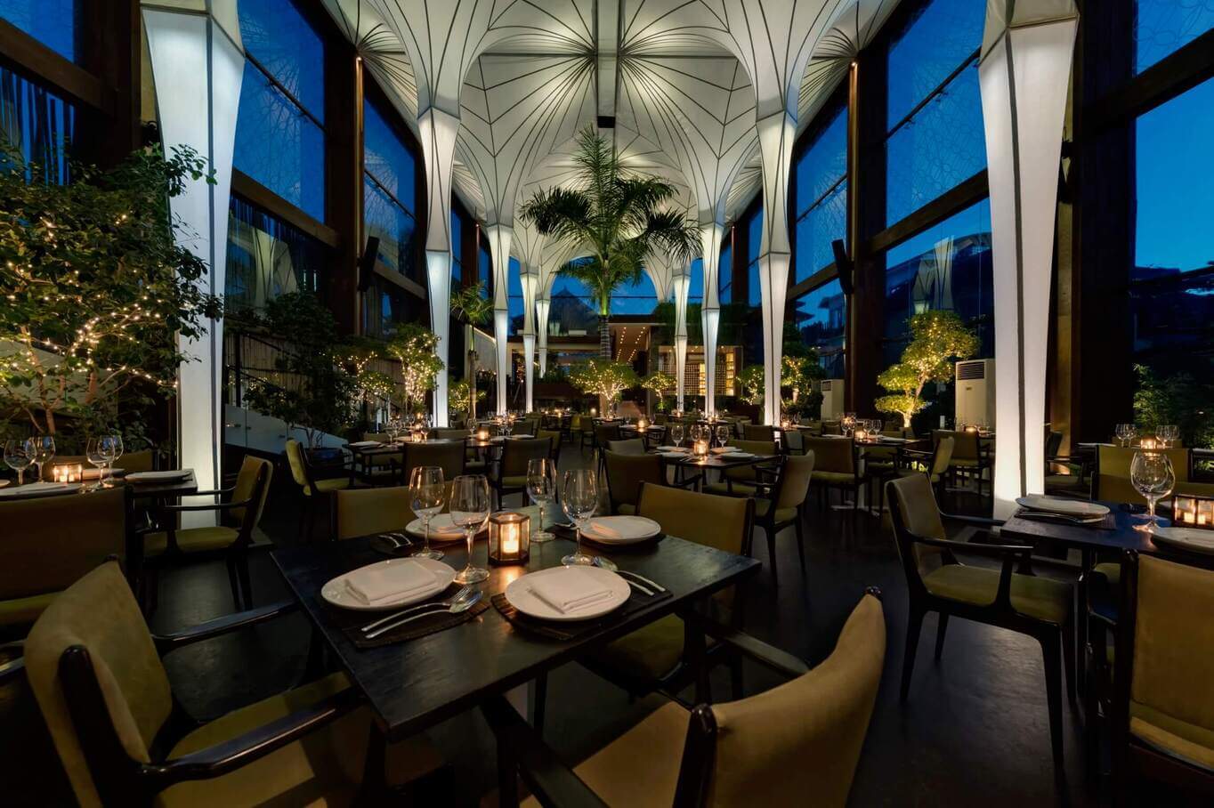 Set amongst a luxurious & theatrical setting, Merah Putih’s illuminated and translucent roof soars above a vibrant & opulent indoor garden. The enclosed & air-conditioned main dining area seats 110 people across the main floor and another 24-30 in three teak pods on a mezzanine. The lush garden & trickling water feature create intimacy amid the majesty, so that you can enjoy a discreet dinner for two or a large social event with family and friends.